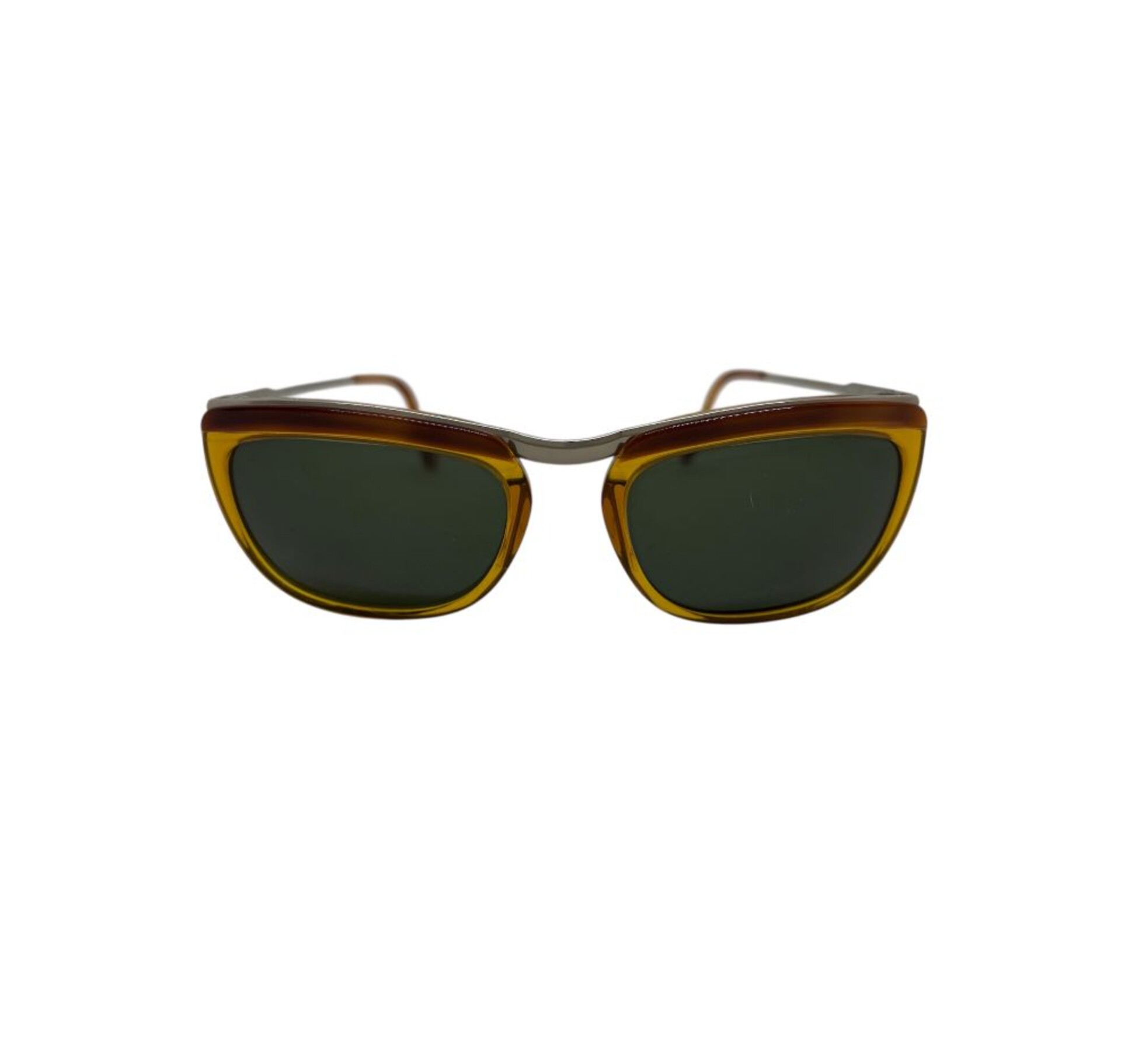Modello vintage unisex in metallo e acetato dalla forma rettangolare, ricercato. Questa montatura è di colore tartarugato mielato e con metallo argento prodotto in Italia.