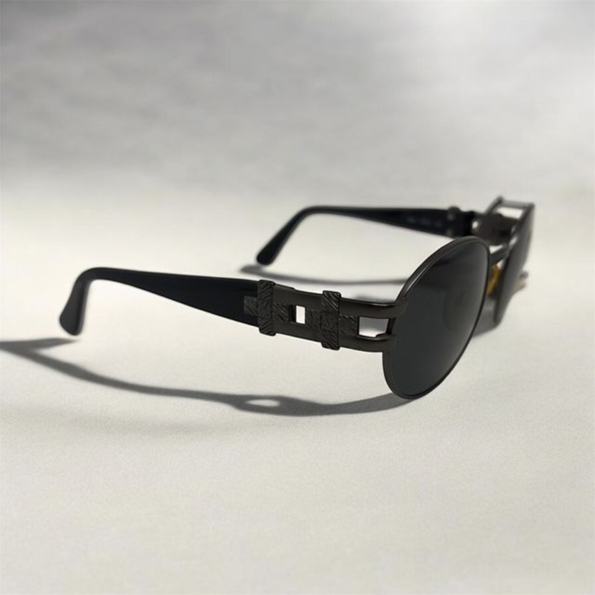Modello vintage anni 90, montatura in metallo nero con lenti grigio modello ovale con asta in acetato attuale e alla moda. Prodotto in Italia.