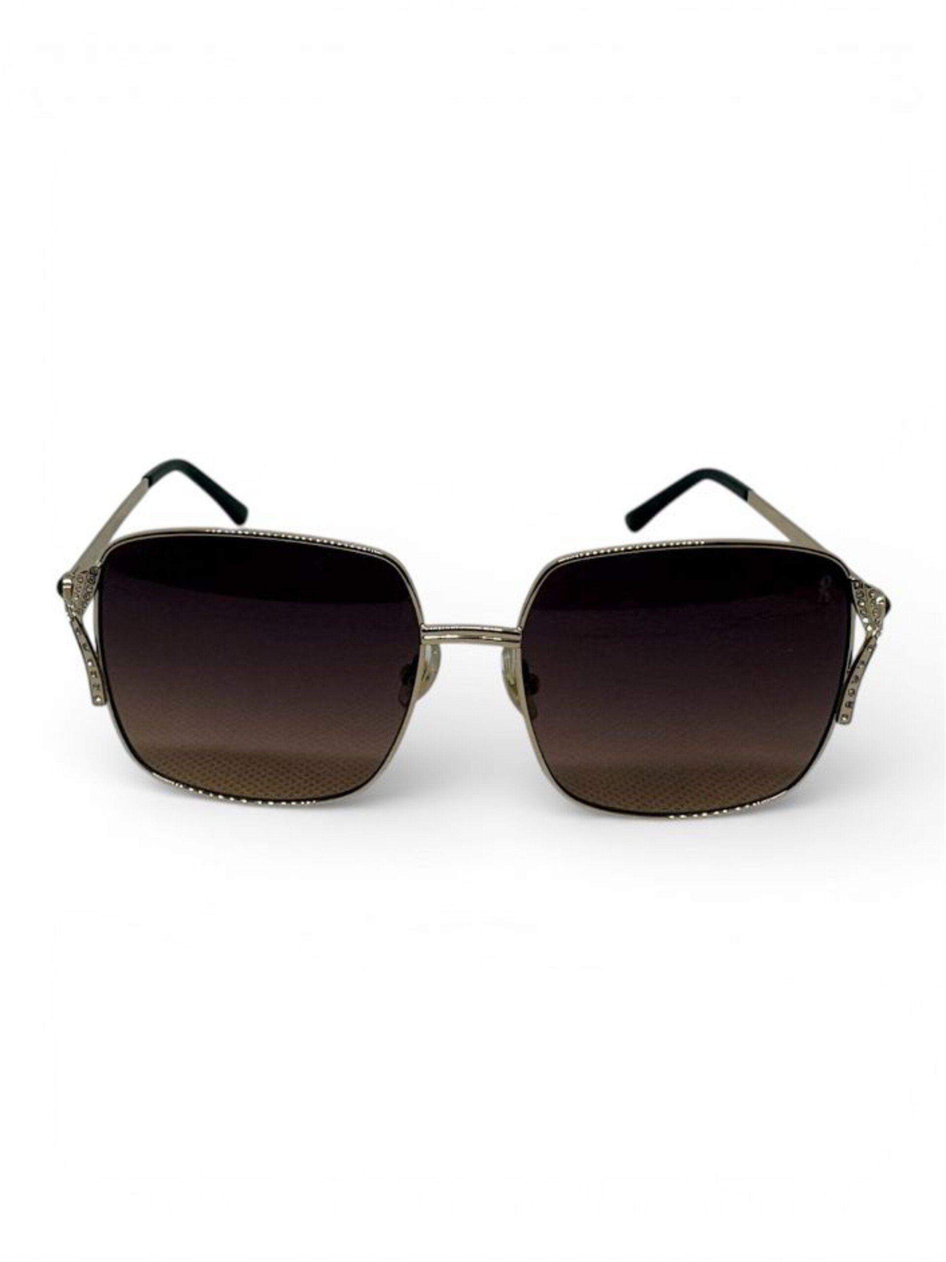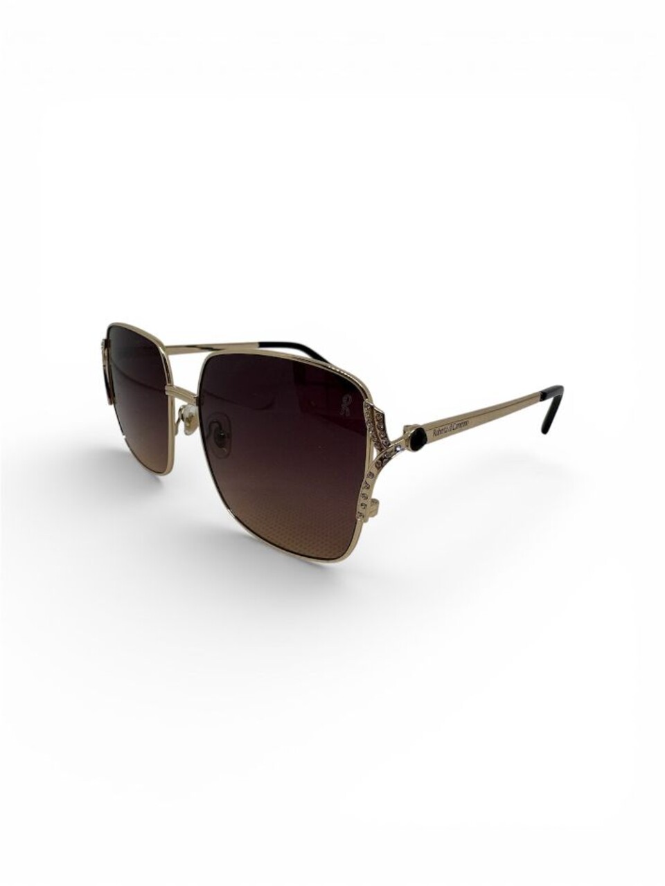 Modello da sole di Roberta di Camerino, femminile e accattivante. Occhiale da sole in metallo dorato dalla forma quadrata con lenti nei toni del bronzo-rosato. Modello chic e alla moda, leggero e arricchito da strass.