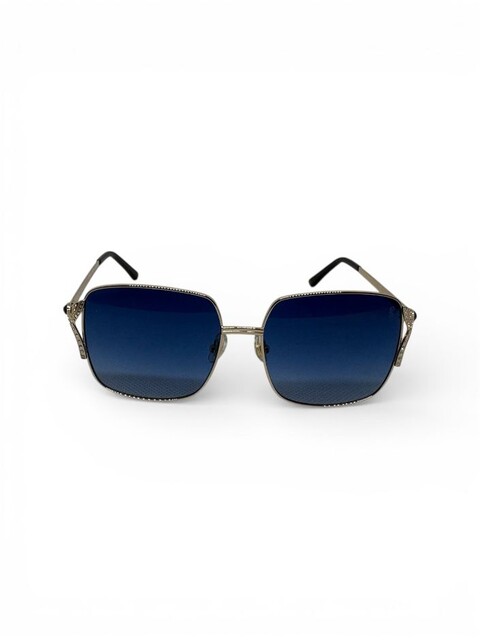 Modello da sole di Roberta di Camerino, femminile e accattivante. Occhiale da sole in metallo dorato dalla forma quadrata con lenti nei toni del blu. Modello chic e alla moda, leggero e arricchito da strass.
