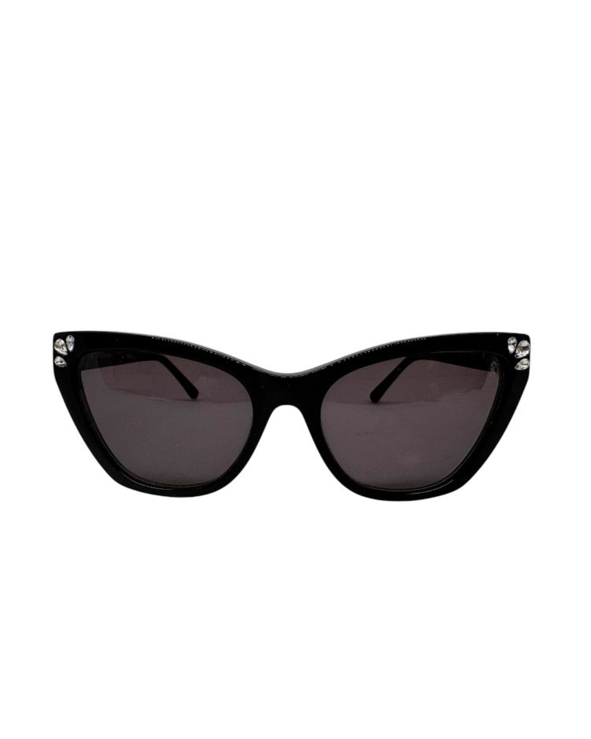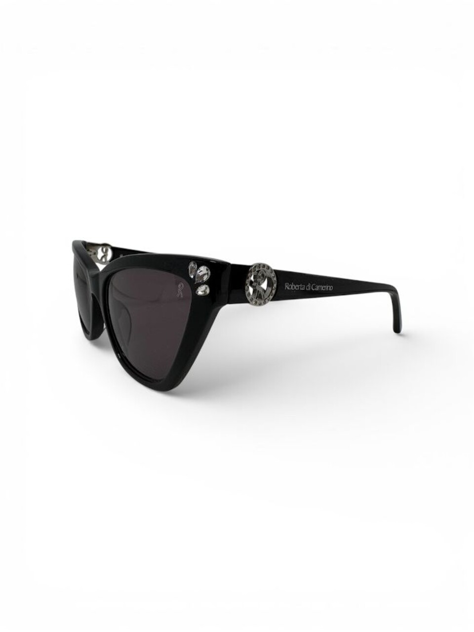 Modello da sole di Roberta di Camerino, femminile e accattivante. Occhiale da sole in acetato con forma a gatta nelle tonalita' del nero con lenti in tinta.